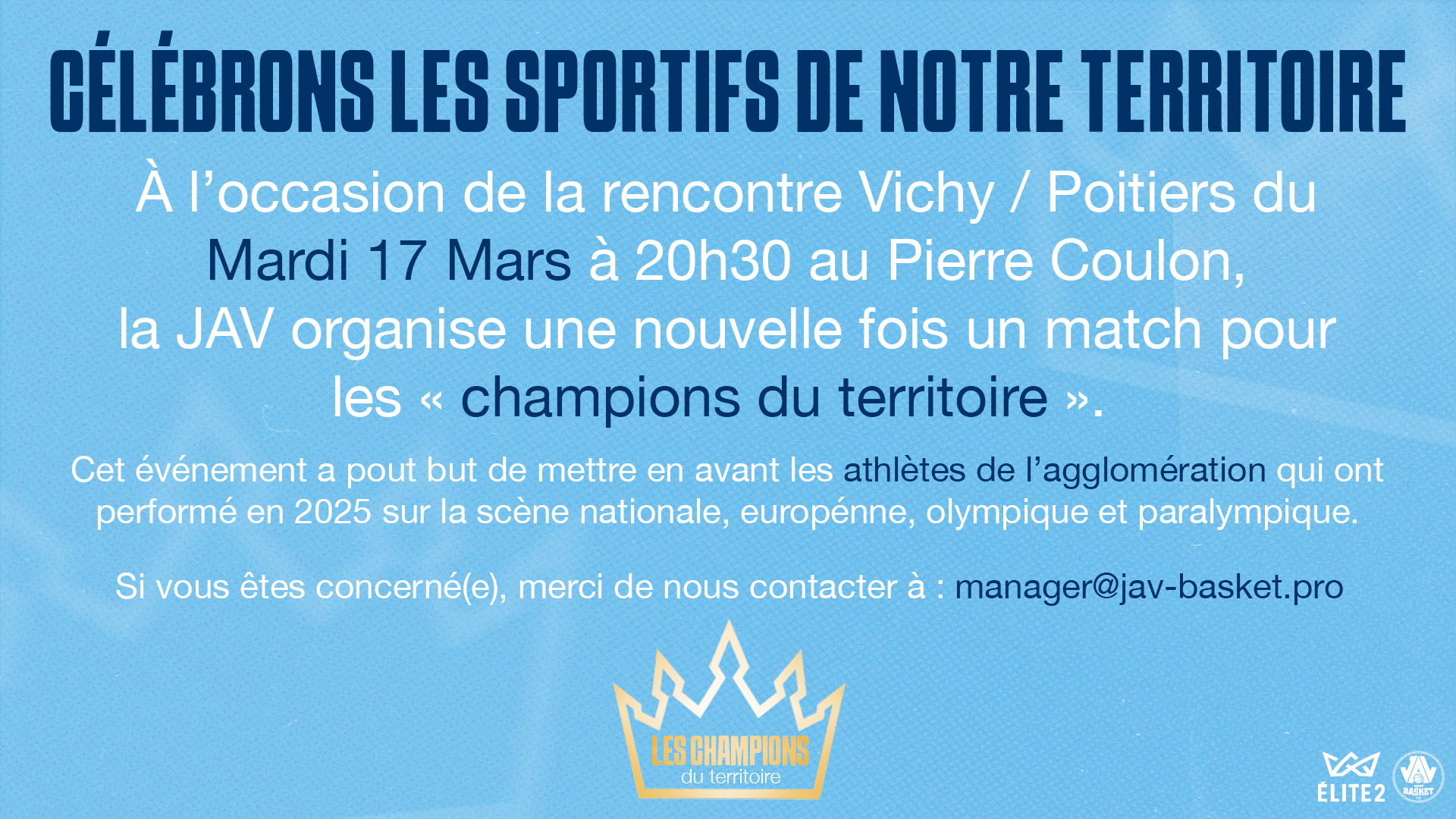À l’occasion du match Vichy Basket / Poitiers le 17 Mars la JAV souhaite mettre en lumière les athlètes de l’agglomération ayant performé en 2025 sur la scène nationale, européenne, mondiale, olympique et paralympique !