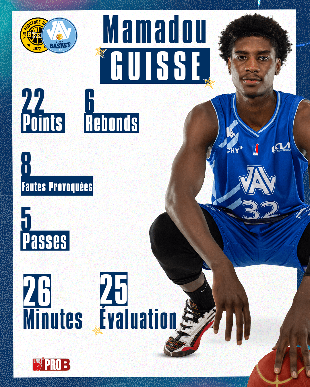 Dernier joueur non cité Clay Mounce. Poste 3 ayant évolué à Groningen (Pays-Bas) l’année dernière. Choix n°1 du coach sur ce poste, il tourne actuellement à 14 points, 6 rebonds pour 15,6 d’évaluation en 27 minutes de jeu. Joueur polyvalent, régulier (1 seul match à moins de 10 points) et avec la volonté de rassembler le collectif, il coche toutes les cases pour l’instant du joueur que souhaite chaque entraineur. Il s’est bien adapté à la division et cela ressemble tout d’un choix payant pour coach Espinosa. Noah Penda et Mamadou Guisse auront fort à faire Samedi soir !