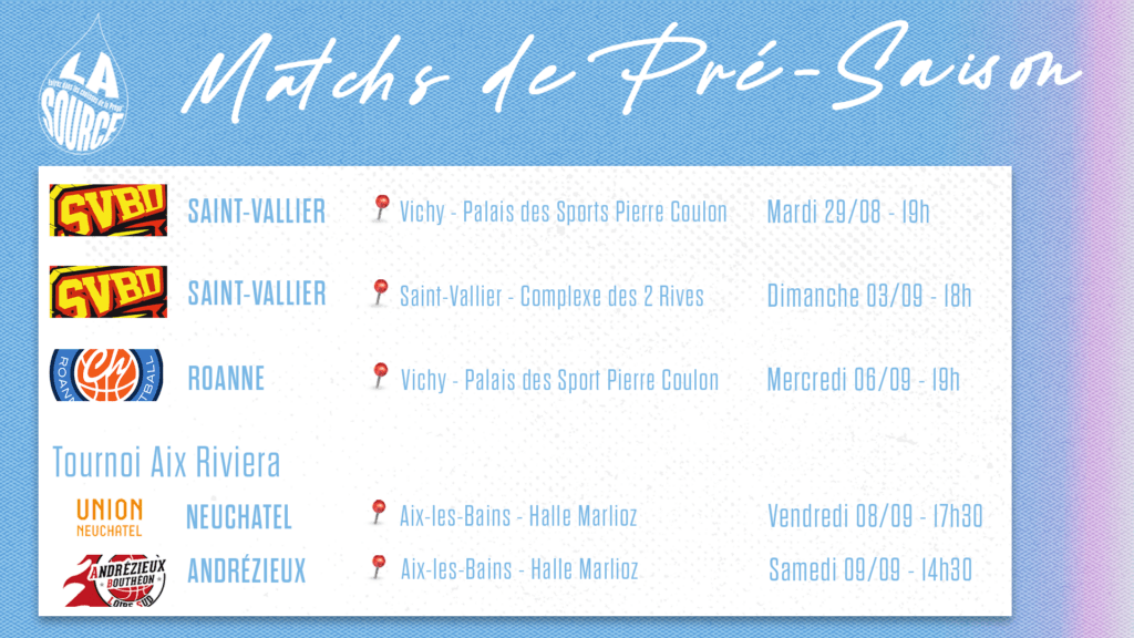 Après avoir commencé de la meilleure des manières la préparation de la saison 2023-24 avec une victoire face à Saint-Vallier (NM1) 101 à 70, nous vous donnons rendez-vous le Mercredi 6 Septembre à 19h pour la réception de nos voisins de la Chorale de Roanne pensionnaire de Betclic ELITE.