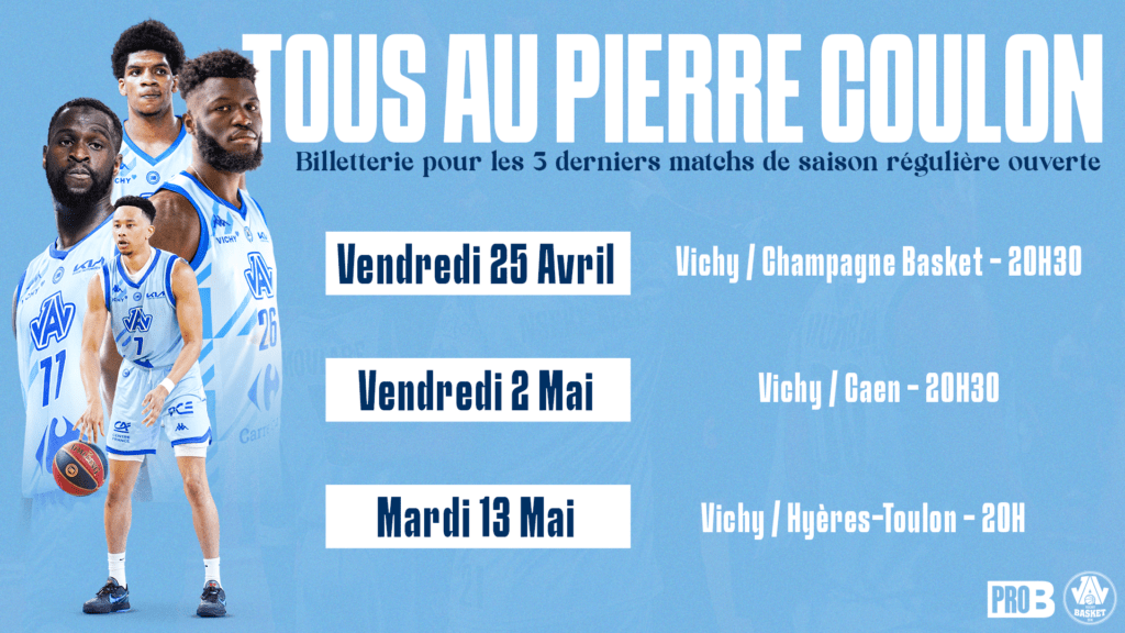 Grâce à la 9e place de notre équipe, nos Vichyssois disputeront donc le premier match de play-in à domicile face à Antibes, ce Vendredi 16 Mai à 20h30.