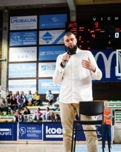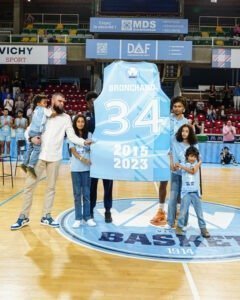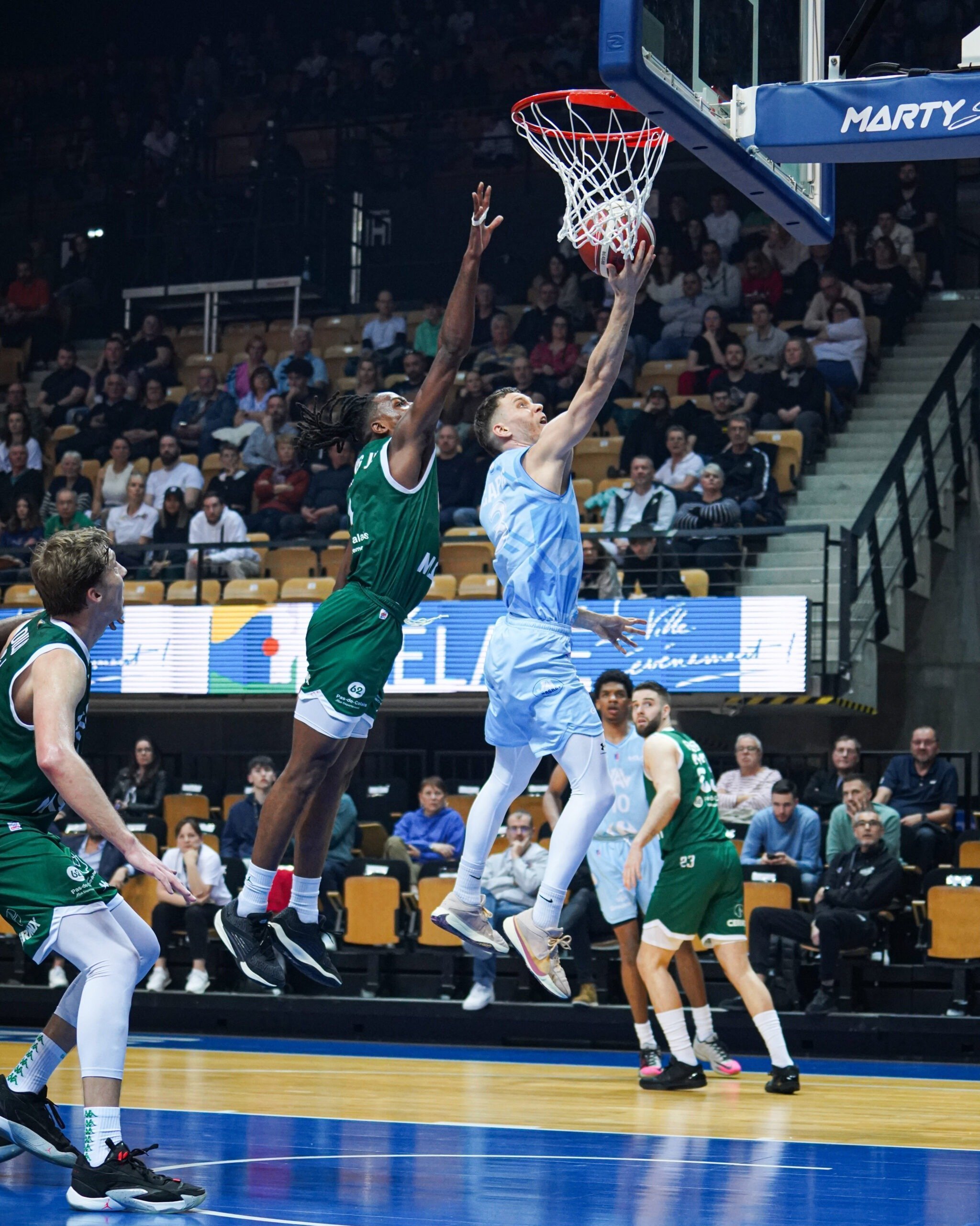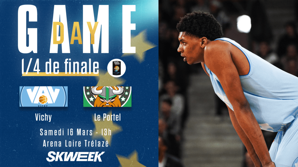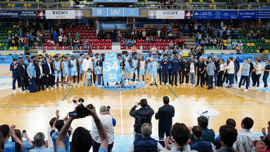 Cependant, résumer la saison 2023-2024 seulement au championnat serait réducteur tant notre équipe a performé et joué chaque rencontre sans calcul. La date du 18 Février et cette finale de Leaders Cup resteront à jamais gravés dans l’histoire du club. Mais cette qualification en finale ne s’est pas jouée sur un match uniquement. Il aura fallu batailler tout d’abord en phase de poules face à Boulazac et Saint-Chamond (3 victoires et 1 défaite), puis affronter La Rochelle en quart de finale et rattraper de 17 points de retard pour rejoindre Poitiers en demi-finale. Dans 2 matchs maitrisés, nos Vichyssois ont donc obtenu le ticket pour la finale à Saint-Chamond face au Champagne Basket. Comme un symbole, c’est dans les derniers instants du match et dos au mur que la lumière est venue, et notre capitaine a sorti sa « Cape » de superhéros. Une interception à 12 secondes de la fin pour arracher la prolongation et prendre feu par la suite. Meilleur joueur de cette finale, il a fait chavirer le cœur des supporters présents ce soir-là et une marée bleue était visible à l’Arena Saint-Étienne Métropole.