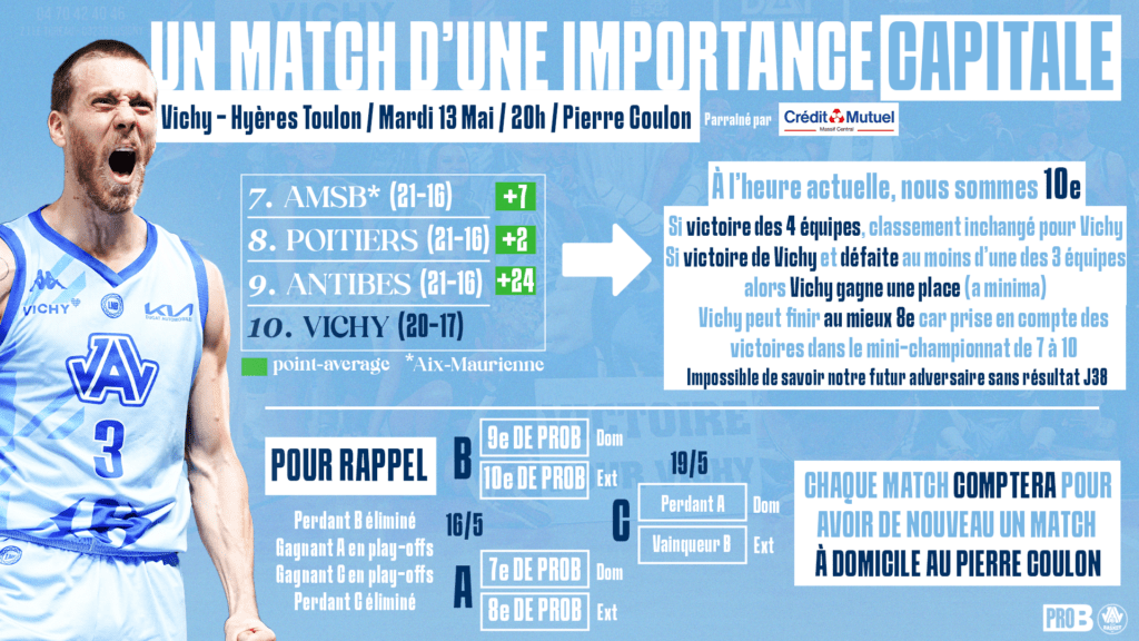 Actuellement en 10e position et si le classement reste figé, nos Vichyssois se déplaceraient. Mais comme indiqué dans le visuel en haut, les hommes de coach Dounia disposent du point-average sur les 3 équipes. Donc une défaite éventuelle d’une des 3 équipes (Aix-Maurienne, Antibes ou Poitiers) permettrait à nos Vichyssois de remonter d’une place. Cependant, si les 3 équipes sont à égalité c’est Aix-Maurienne qui serait 7e car les Savoyards sont en tête dans le mini-championnat (confrontation entre les 4 équipes). Nos Vichyssois peuvent donc finir au mieux 8e.