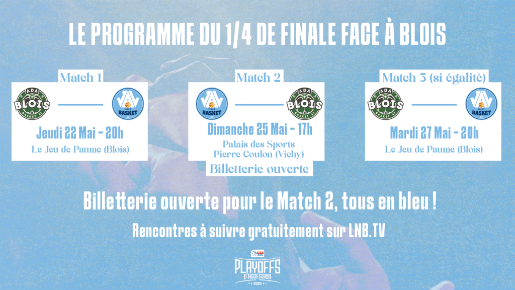 C’est parti pour une nouvelle compétition ! Après avoir brillamment obtenu leur ticket pour les playoffs grâce au play-in, nos Vichyssois démarrent ce 1/4 de Finale face à Blois ce soir à 20h au Jeu de Paume (à Blois).