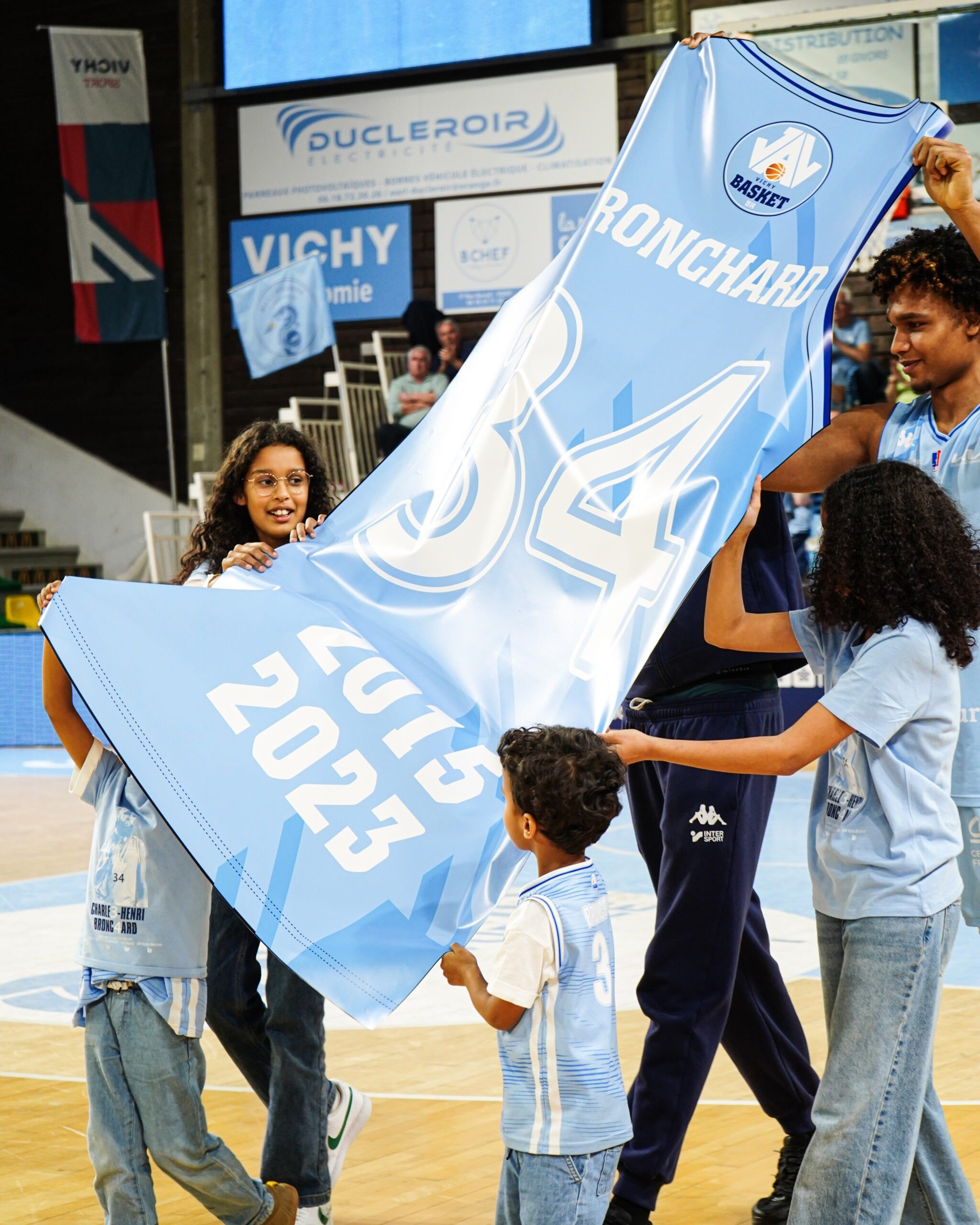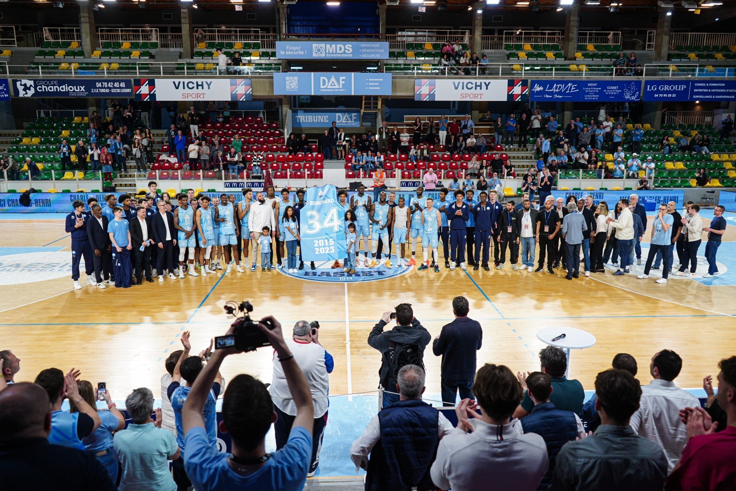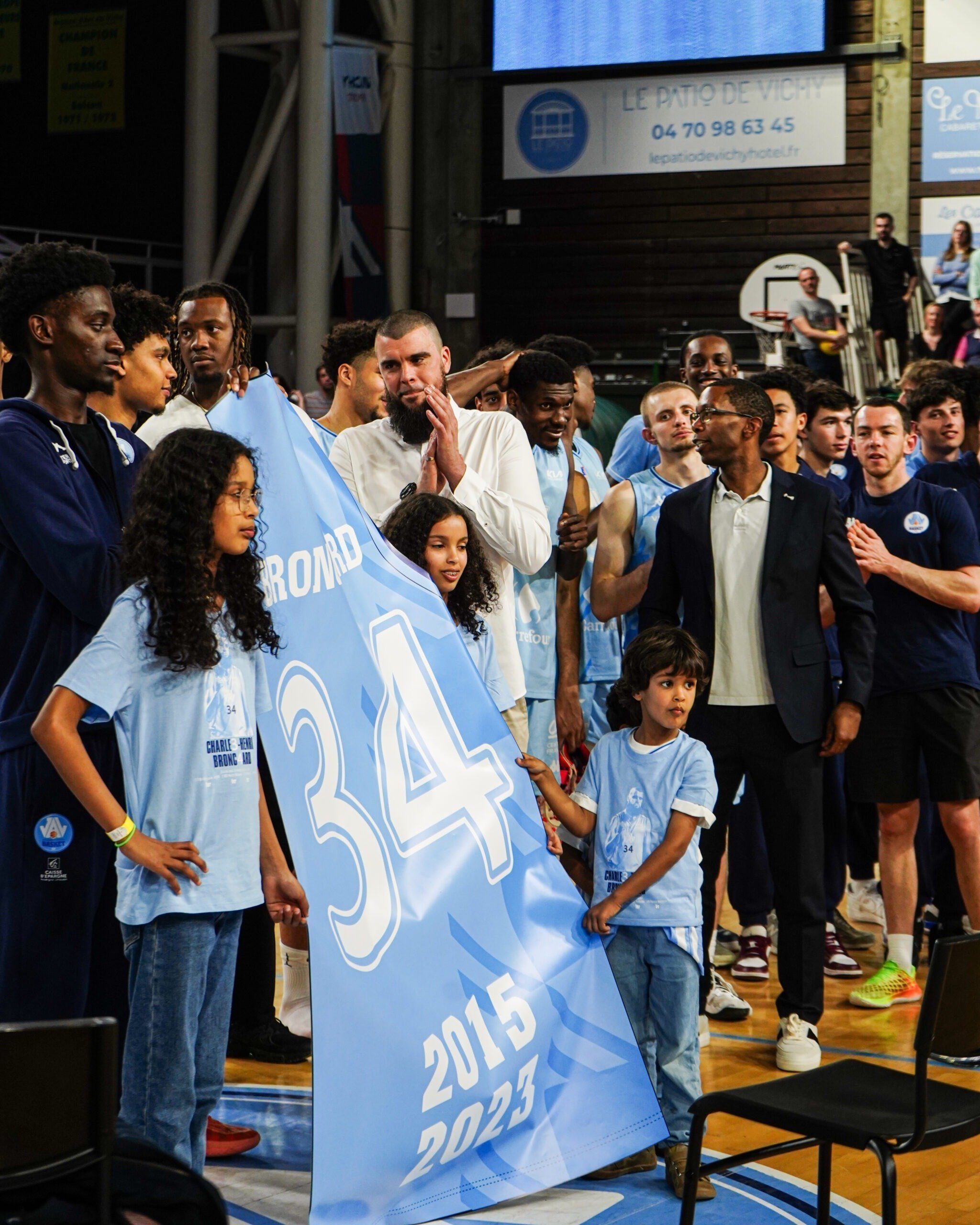 Ce Vendredi 22 Mars, c’était aussi l’occasion de se remémorer la carrière de Charles-Henri avec des personnes ayant compté pour lui avec des témoignages poignants. Jean-Luc Martin à Autun en Nationale 1, Claude Bergeaud à Pau, Jean-Michel Sénégal à la JL Bourg. Mais aussi des anciens coéquipiers comme David Denave avec lequel il a partagé 255 fois les parquets (Pau, Saint-Vallier et Vichy). Notre actuel entraineur Guillaume Vizade et actuel Président Yann Le Diouris étaient aussi de la partie lors de la cérémonie. Une trentaine de personnes n’ayant pas pu se déplacer pour cet hommage ont tenu à adresser à notre ancien numéro 34 leurs félicitations par vidéo.