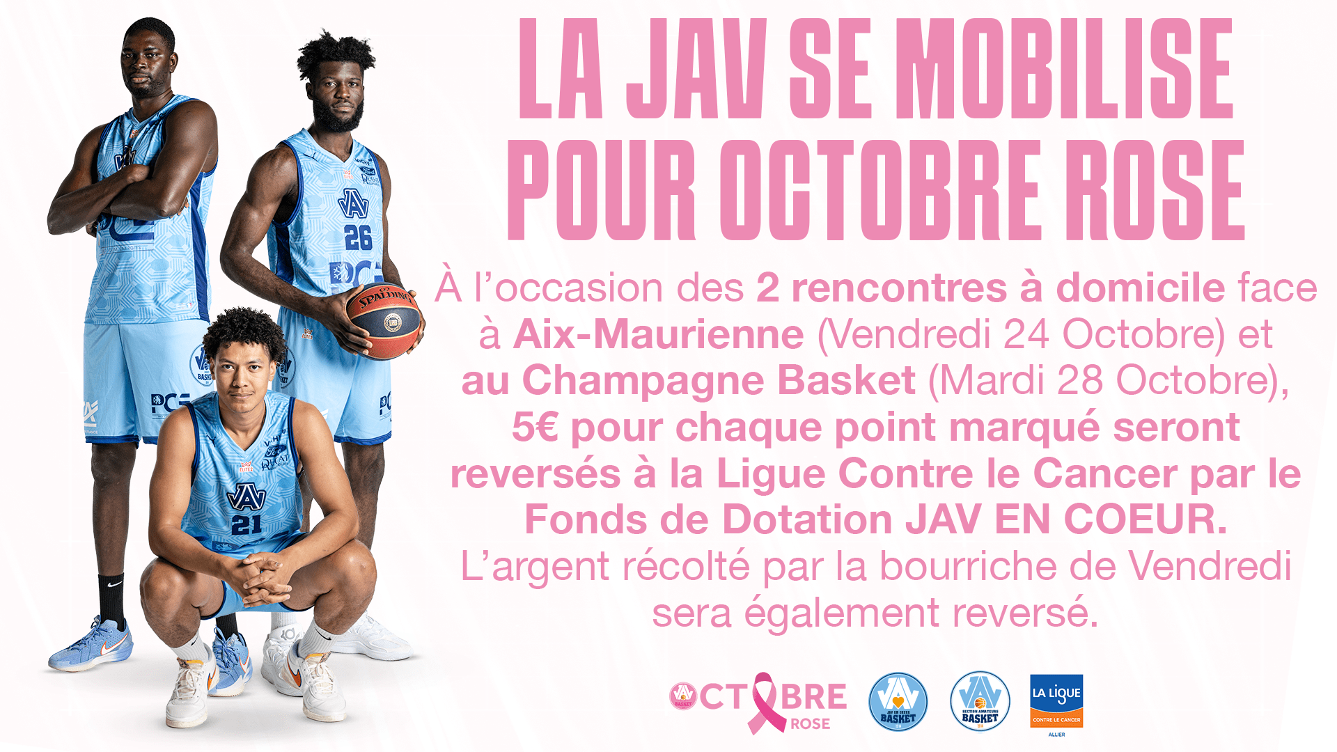 Dans le cadre d’Octobre Rose, campagne annuelle mondiale de communication destinée à sensibiliser les femmes au dépistage du cancer du sein et à récolter des fonds pour la recherche, la Ja Vichy Basket s’associe à la Ligue contre le Cancer de l’Allier avec plusieurs activations.