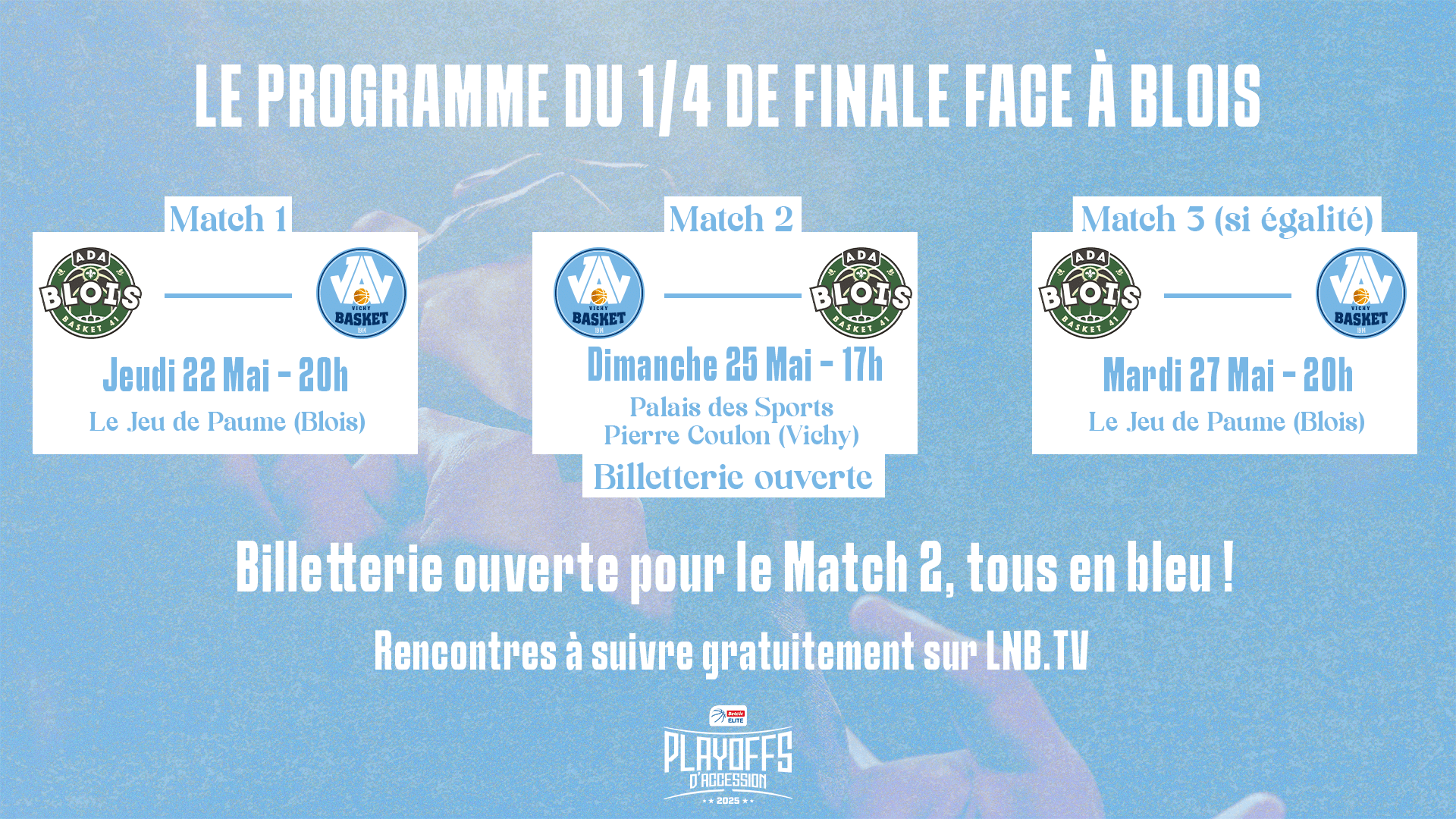 Grâce à la brillante victoire de notre équipe hier soir à Poitiers, nos Vichyssois disputeront les playoffs d’accession avec comme adversaire Blois en quart de finale. Match aller à Blois ce Jeudi 22 Mai à 20h. Le match retour se déroulera ce Dimanche 25 Mai à 17h au Pierre Coulon